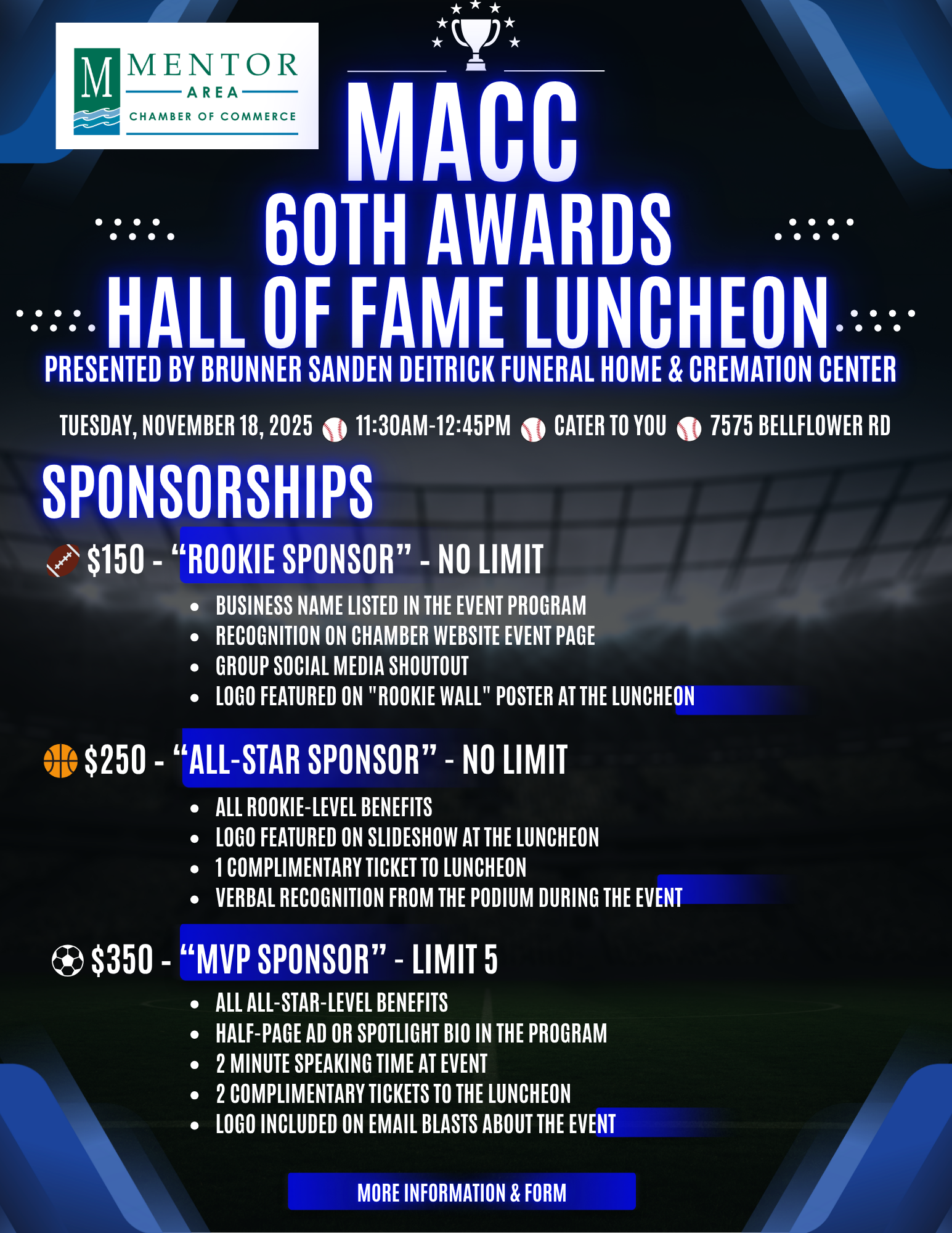 You’re Invited to the Mentor Chamber 60th Awards Hall of Fame Luncheon Presented by Brunner Sanden Deitrick Funeral Home & Cremation Center!  Join us as we honor our Business Leader of the Year, Our Business of the Year and recognize our past award recipients.